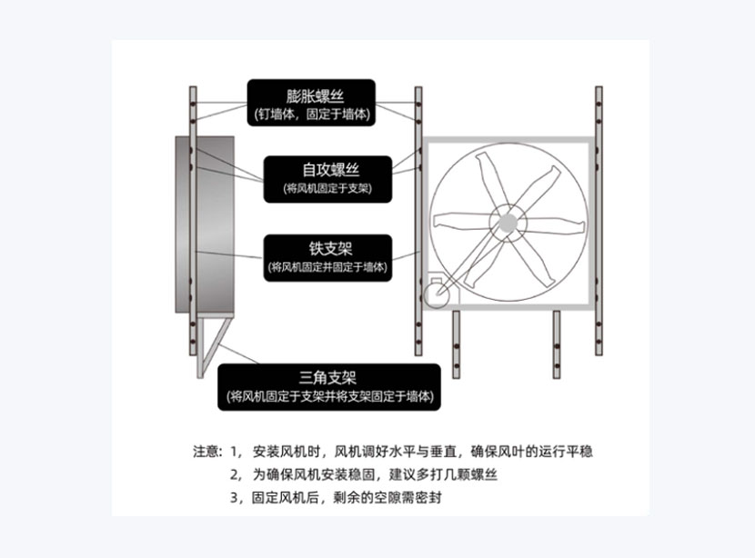 安装前:检查风机完整性及紧固件状态。选择出风口环境,确保无大障碍物。 安装时:保持风机水平稳固。确保电机调节螺栓位置便于操作。支架需稳固,必要时进行加固。安装后检查并密封空隙。 安装后:检查风机内部是否遗留工具或杂物。拨动扇叶检查转动是否顺畅。运转中如有异常应停机检查。